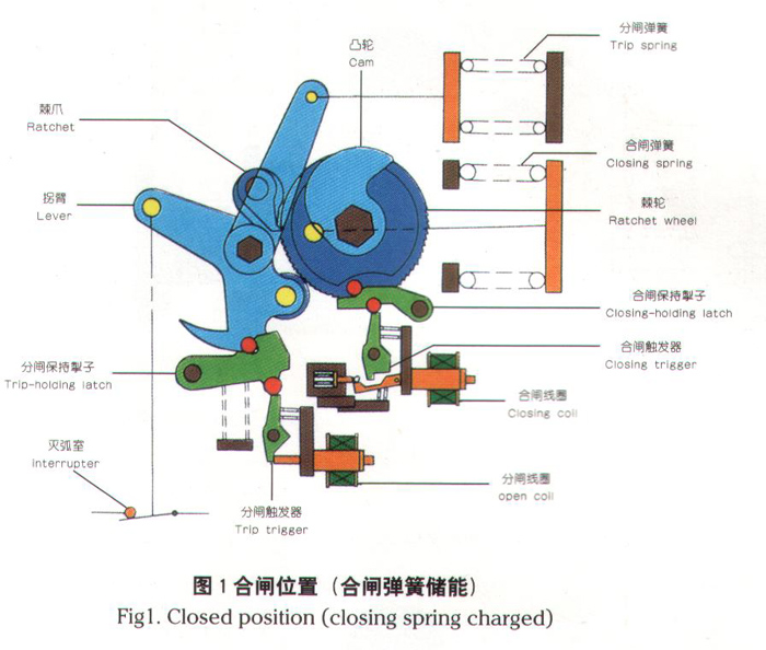 圖1所示狀態(tài)為開關(guān)處于合閘位置,合閘彈簧已儲能(同時分閘彈簧也已儲能完畢)。此時儲能的分閘彈簧使主拐臂受到偏向分閘位置的力,但在分閘觸發(fā)器和分閘保持掣子的作用下將其鎖住,開關(guān)保持在合閘位置。
